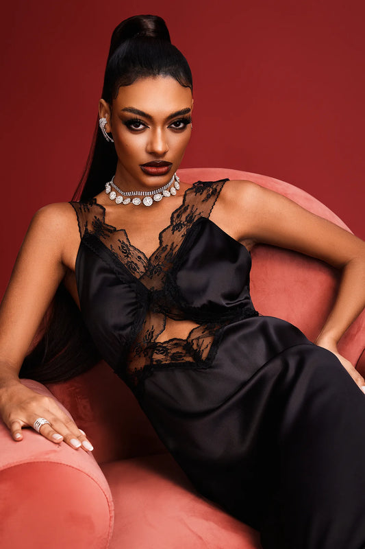 Pale Lace Cut Out Satin Maxi Dress