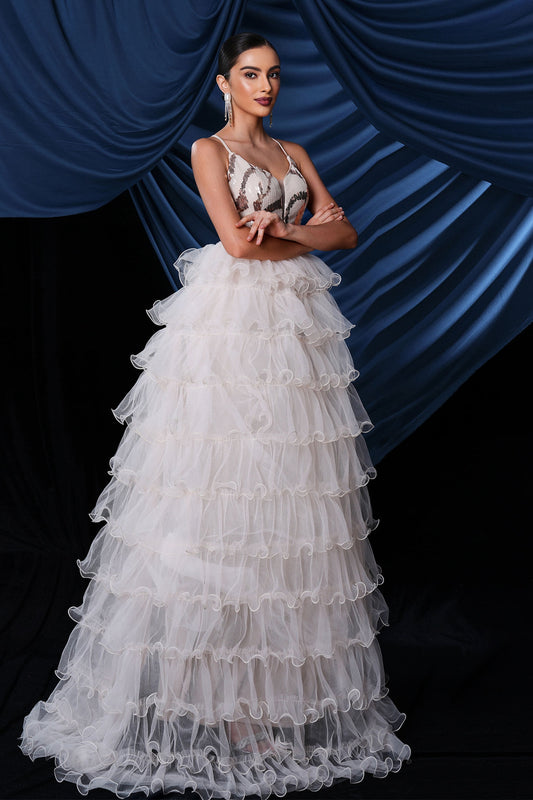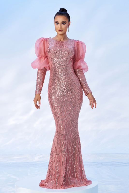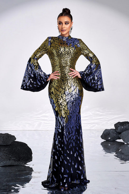 Backless Deep V Neck Long Sleeve Sequin Prom Dress
