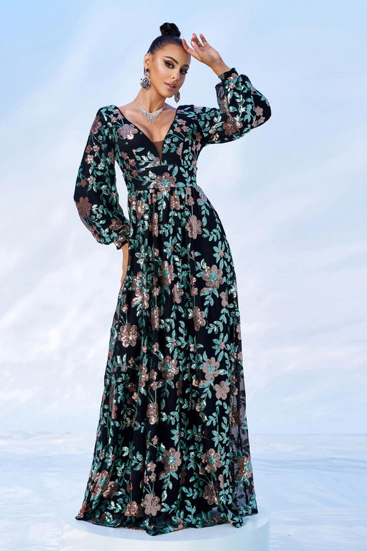 V Neck Chiffon Lantern Sleeve Sequin Prom Dress