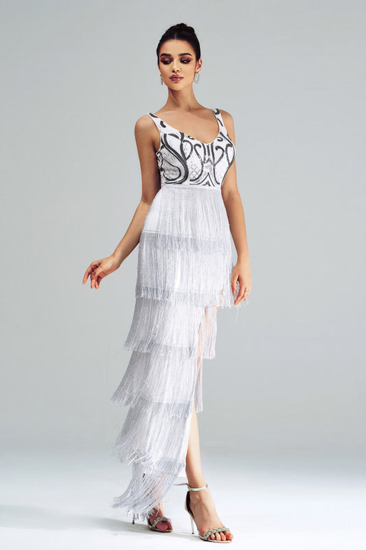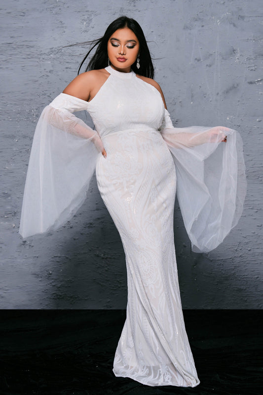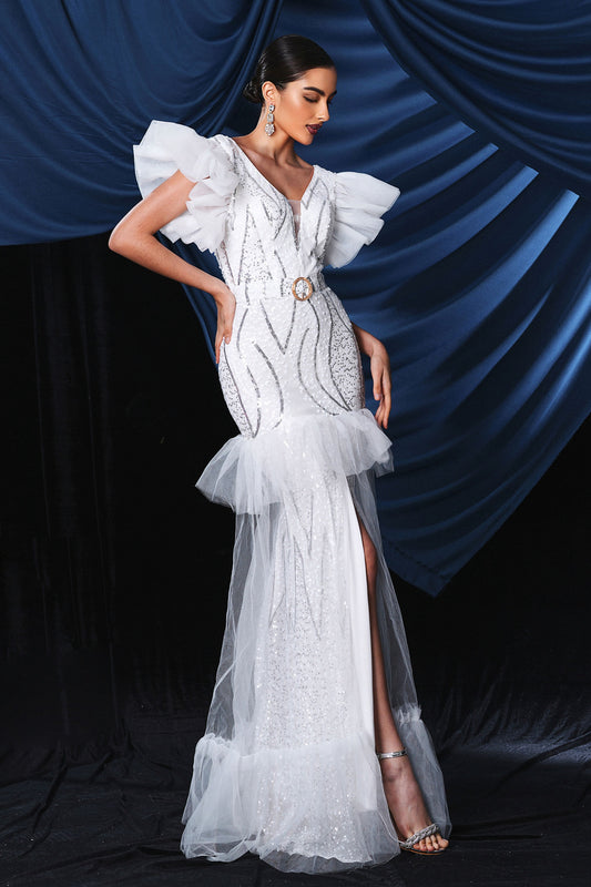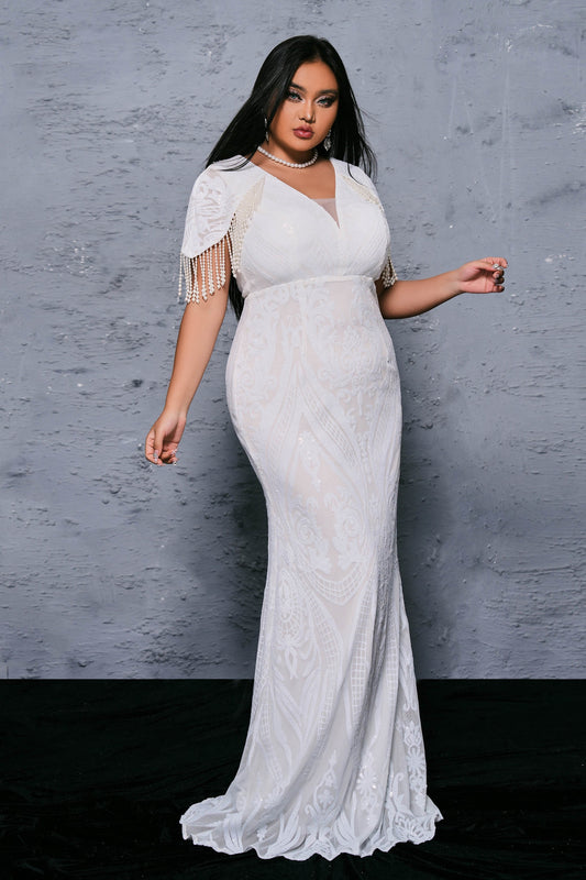 White Mermaid Sequins V-neck Beading Plus Size Prom Dress