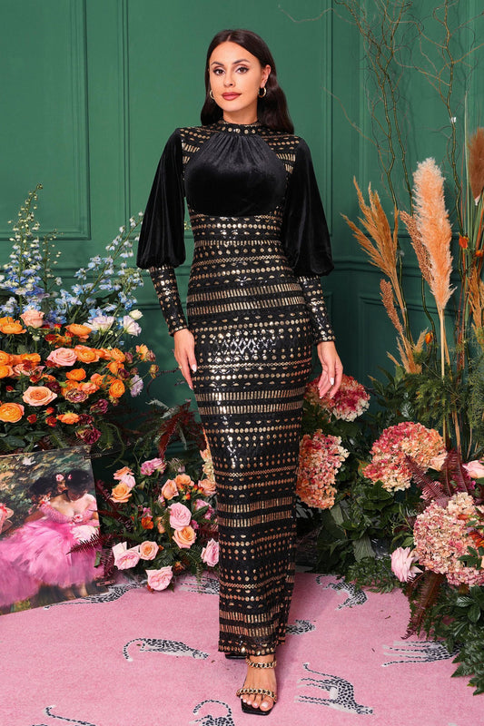 Vintage Black Velvet Sequin Long Sleeve Maxi Dress