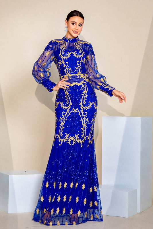 Blue Sequin Long Sleeve Evening Dresses with Mesh Ruffles