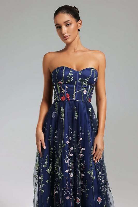 Tusare Open Shoulder Embroidery Maxi Dress - Floral