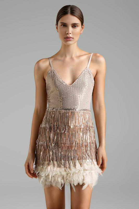 Keely Sequins Fringe Feather Mini Dress - Golden