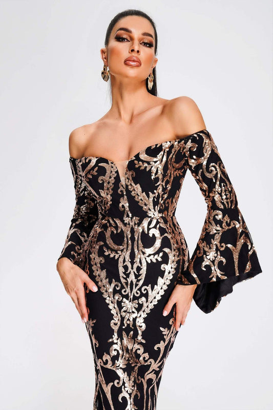 Riley Off Shoulders Long Sleeves Flowers Velvet Maxi Dress