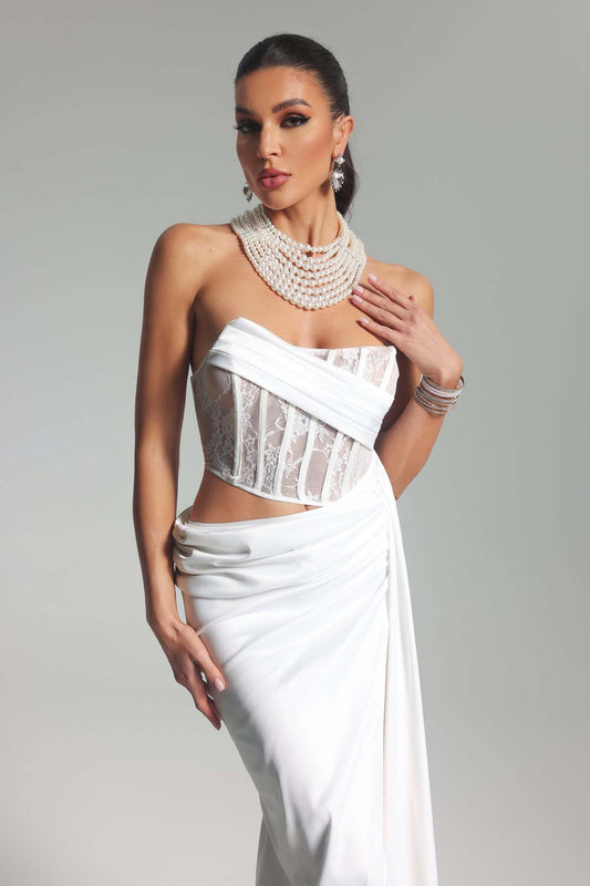 Lauren Strapless Corset Satin Maxi Dress-White